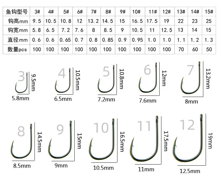 This 100-piece pack of high carbon steel fishing hooks includes sizes #3 to #12, providing versatility for a variety of fishing conditions and target species. Each black, barbed hook features a hole for easy attachment to lines or lures, ensuring secure and reliable performance. Made from durable steel, these hooks resist bending and maintain sharpness for consistent catches. Ideal for both freshwater and saltwater fishing, this assorted hook set is a practical addition to any angler’s tackle box.