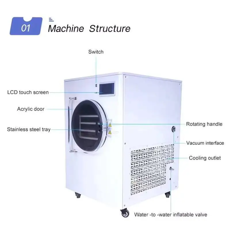 This household food freeze dryer is designed for efficient, automatic food preservation through continuous vacuum freeze-drying technology. Ideal for home use, it helps retain the original flavor, texture, and nutrients of fruits, vegetables, meats, and prepared meals while extending shelf life. The portable, user-friendly design allows for convenient operation and consistent drying results without complex setup. Perfect for families, emergency preparedness, and long-term food storage, this freeze dryer offers a reliable solution for preserving food at home.